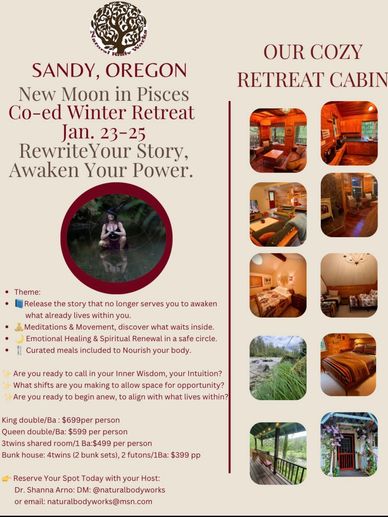 This transformative three-day retreat invites you to release the stories that no longer serve you and reconnect with the power that already lives within. Set against the peaceful backdrop of Oregon’s natural beauty, our time together will include guided meditations, restorative movement, emotional healing practices, and intentional circle work, all created to support deep renewal and aligned growth.